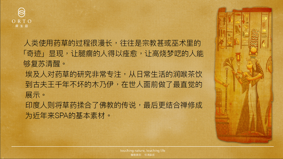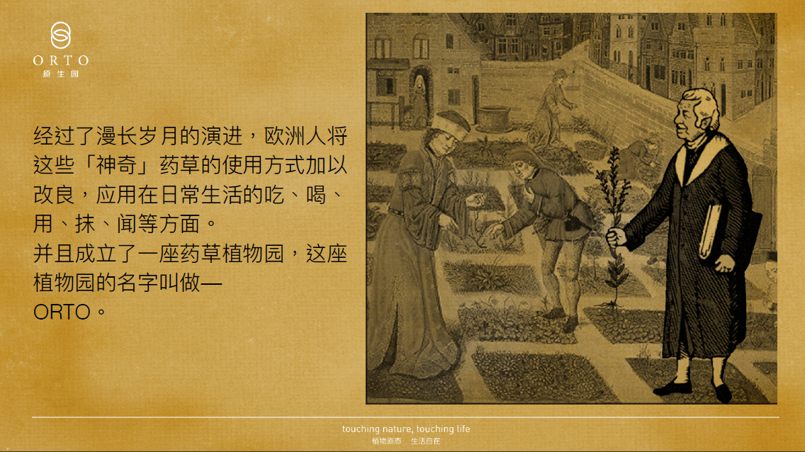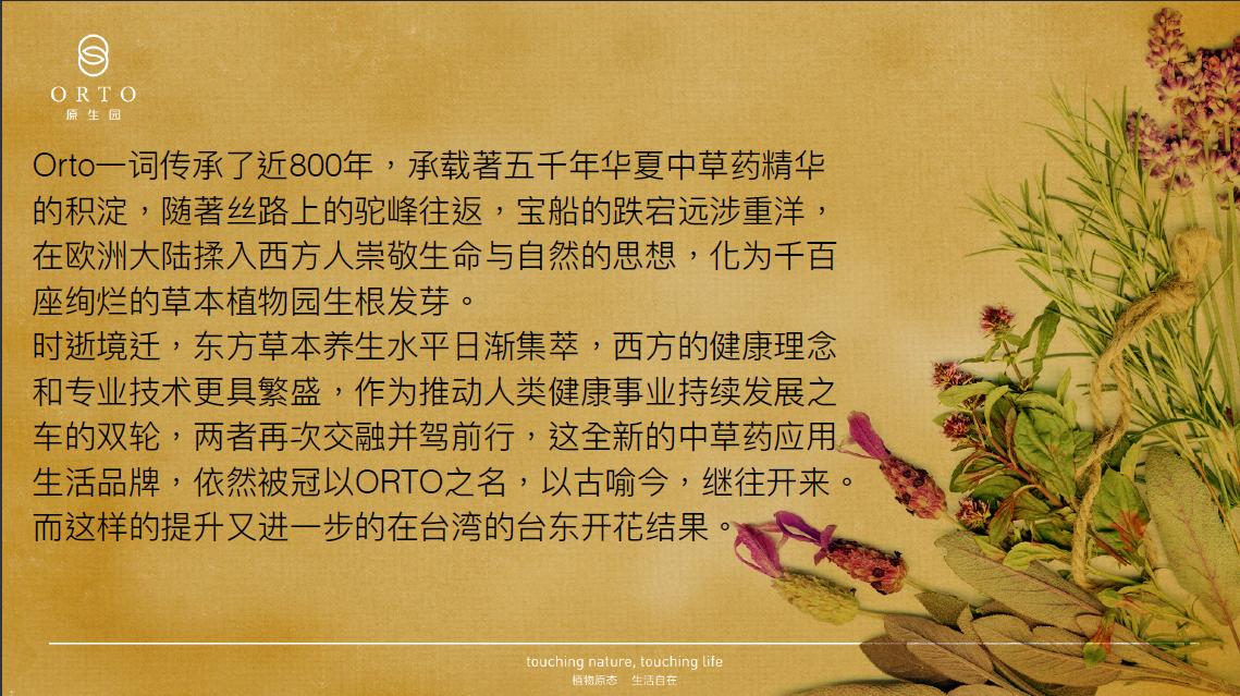 近百年前,在西方歐洲人將中草藥加以改良,應用在日常生活上,並對自然和生命探索精神的浸潤下,一座座草本植物園在南歐破土而出。ORTO,即源自這波承載東西草本精華草本園的名字。
